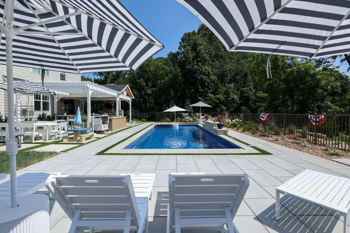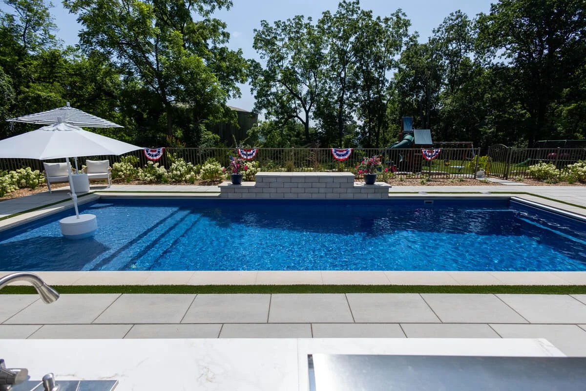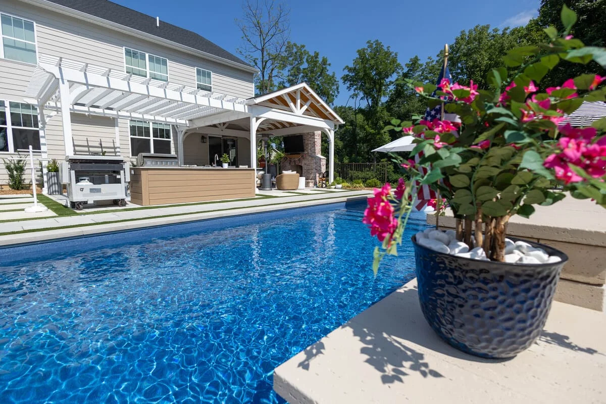 The customer wanted their backyard to feel like a resort. We built the patio, grill island and shade structure last summer as phase 1 of the project and adding the pool to their already beautiful back yard was phase 2.