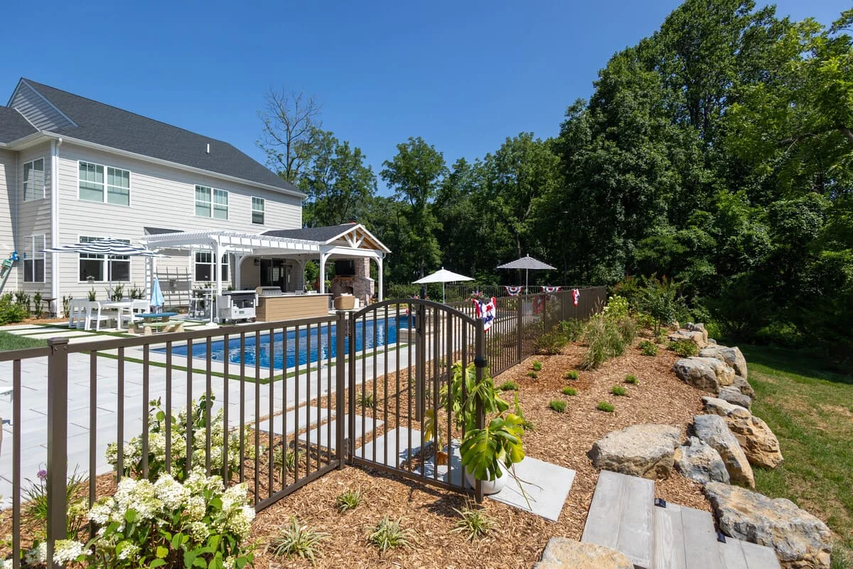 We added a pool to their backyard. Finished the project off with boulders to help retain soil and landscape beds. We added Sod and plantings to complete the design of the project.